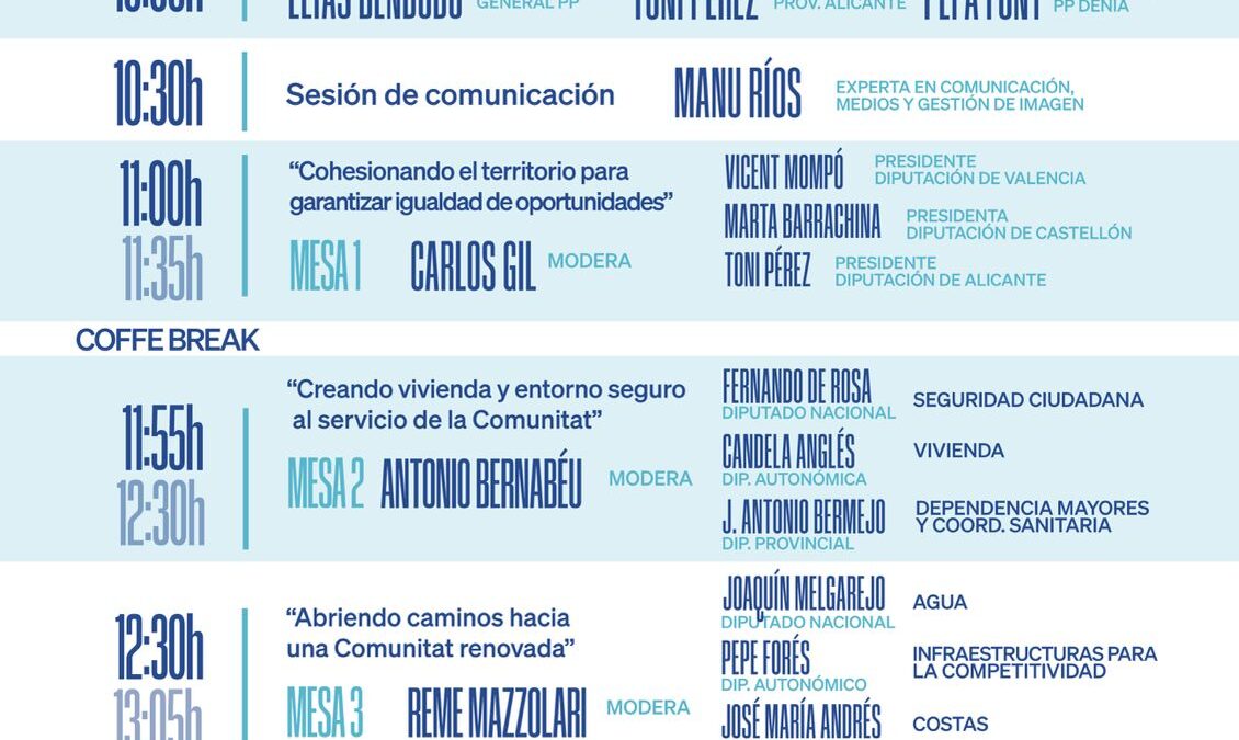 La inauguración correrá a cargo de Elías Bendodo vicesecretario general del PP. La primera mesa contará con la intervención de Vicent Mompó, presidente del PP en la provincia de Valencia, Marta Barrachina, presidenta de Castellón, y Toni Pérez, presidente del PP en la provincia de Alicante. Las cuatro mesas abordarán cuestiones como seguridad, vivienda, dependencia, agua, infraestructuras, costas, turismo, financiación autonómica y tributación. Hay tres ponentes en cada mesa representando al ámbito nacional, autonómico y provincial.